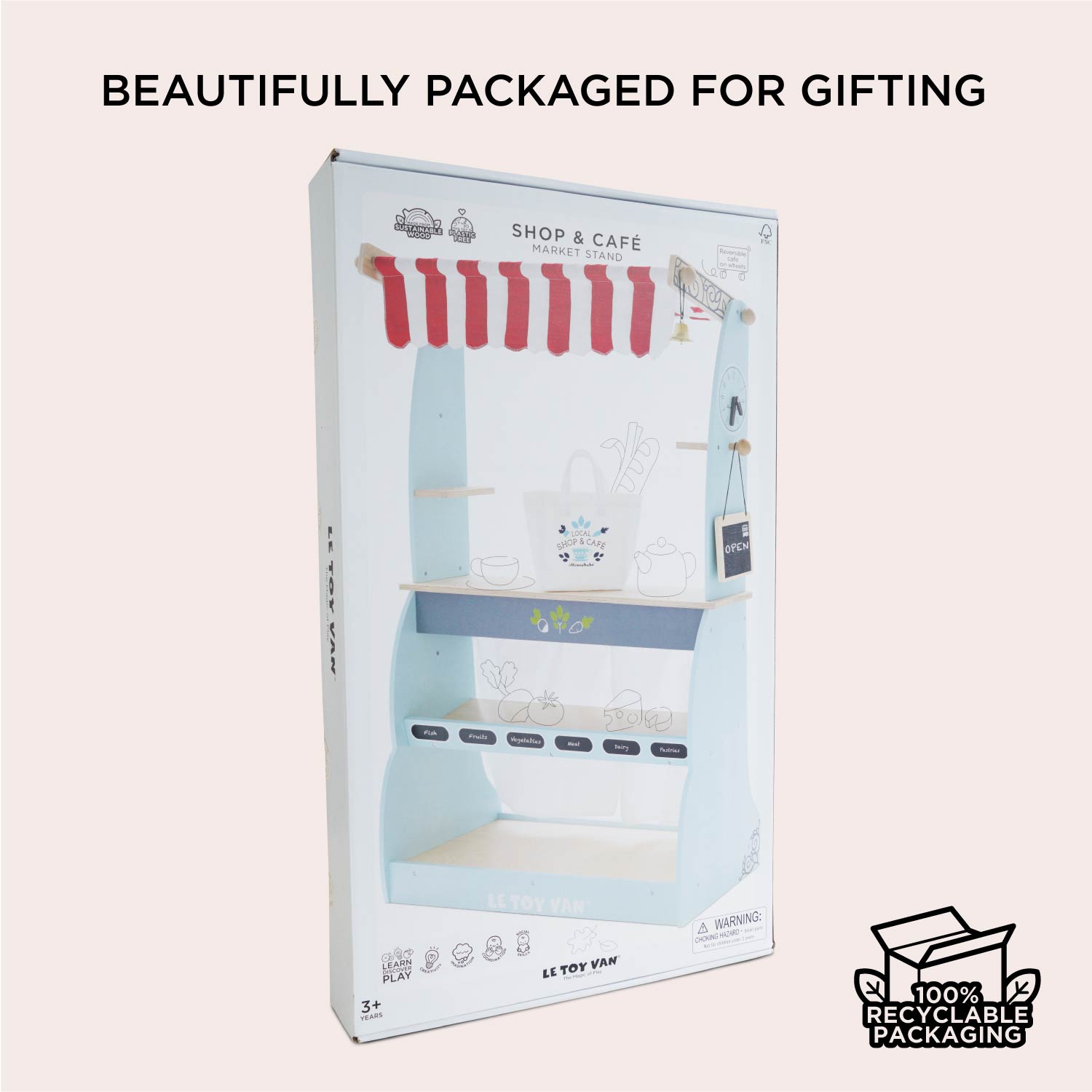 Our amazing wooden Shop and Café stall is a multi award winner and a firm favourite. This 2-in-1 reversible toy is full of wonder and is sure to ignite little imaginations. Designed by our team of talented toy makers for immersive roleplay, day-after-day. Little ones will adore serving customers at the café, then simply turn it around to reveal a market style shop complete with shelves, ideal for housing our wooden food crates.